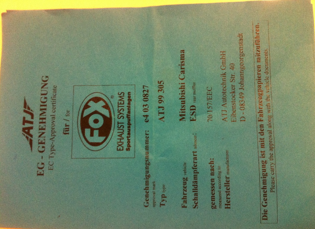 Habe jetzt die EG-Genehmigung erhalten von Fox und wenn ich mir das jetzt anschau steht ganz unten: Die Genehmigung ist mit den Fahrzeugpapieren mitzuführen. (siehe Foto)