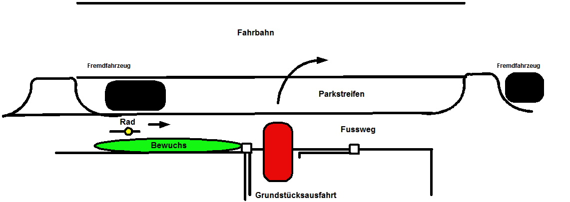Ebend gesehen. Ist das ein Fußweg (wie in der SKizze beschrieben) oder ein Radweg (vlt in kombi mit Fußweg) gewesen. Weil Wenn es nur ein Fußweg war, hat der Radfahrer rein Rechtlich auf der Straße zu gurken! Weil man bei einem Fußweg NICHT mit Radfahrern rechnen MUSS. Nur mit Fußgänger, die ja in den meisten Fällen wesentlich langsamer sind.