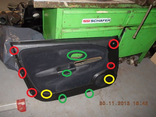 - grüne kreise, je eine schraube (die schale aus dem türöffner hinterher rausnehmen)