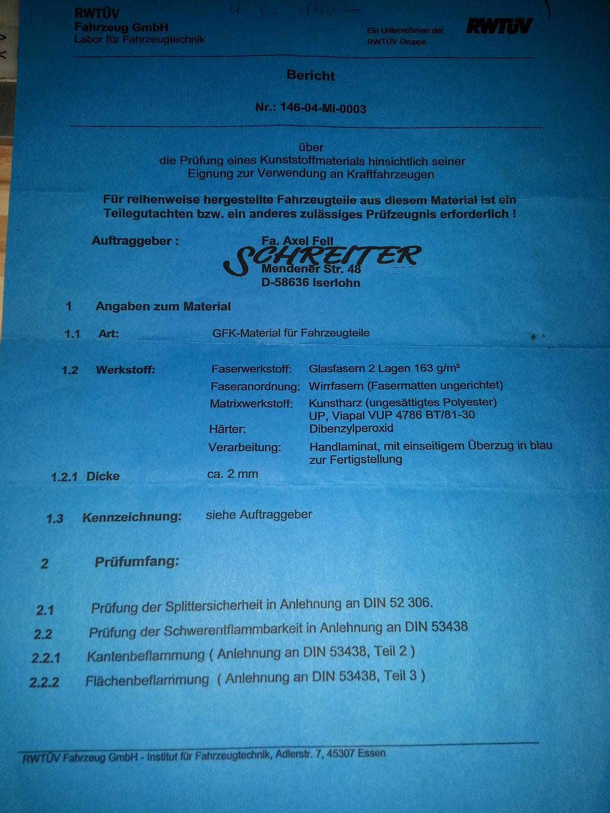 Der dritte war dann a bissel kompetenter und erklärte mir, das son Materialgutachten ja schön und gut ist aber es ja nix über die konstruktion ansich aussagt. das Problem ist, das solche Teile wie Lippe und Heckspoiler direkt im Wind stehen und es gerade bei diesen Teilen wichtig ist, das sie auf Ihre konstruktion gestestet werden. Materialgutachten bringt dir garnix wenn dir das ding bei Vmax durch Konstuktionsfehlern absegelt. Und da will sich am Ende kein Prüfer den Schuh für anziehen.