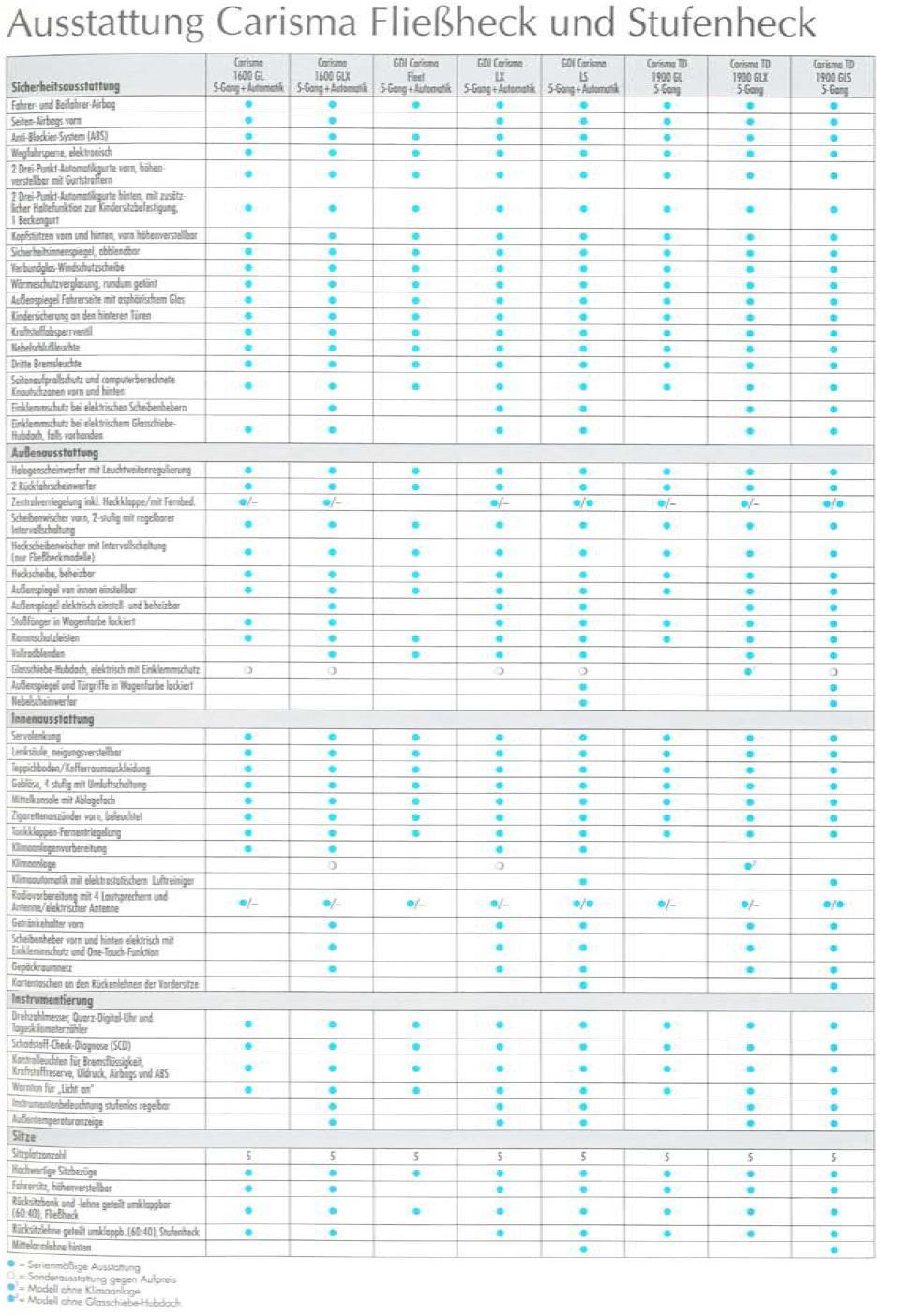 Hab mal die Tabelle mit den Ausstattungsmerkmalen rangehangen. Die kommt von Mitsubishi (ist aus nem Katalog vom Carisma) und stimmt somit 100% (hab das Teil als PDF, doch leider kann ich hier keine 5MB hochladen). Leider ist die Quali nicht die Beste.