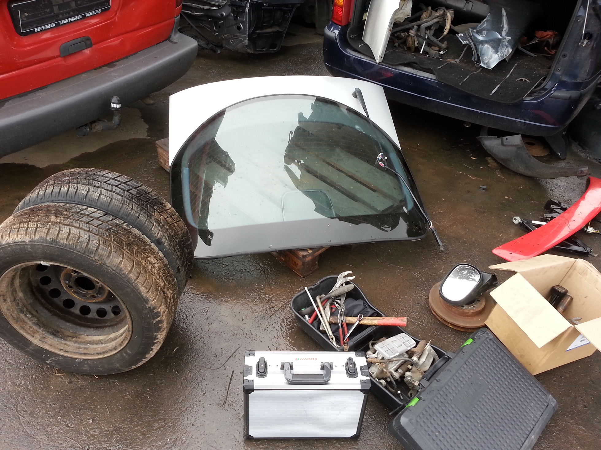 Ich hatte mir eine Heckklappe, komplette Bremse HA (war sogut wie neu) sowie zwei gute Winterreifen und einiges an kleinteile abgebaut. Auch ein Heckspoiler habe ich bereits günstig erwerben können, hab ihn mal grob draufgestellt.