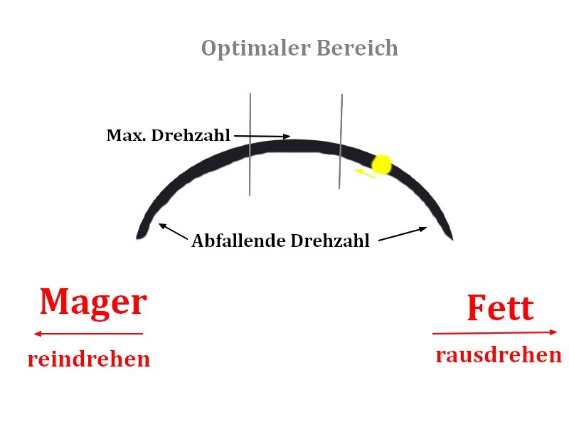 Und ich kann auch nicht genau sagen, ob das auch auf nen Schwimmervergaser zutrifft, aber bei nem Membranvergaser (z.B. Kettensäge, Freischneider, etc...) kann man mit der L und H Schraube quasi in nem Bogen mager und fett einstellen, wenn du die H SChraube (für max drehzahlbereich) weiter rausdrehst (am besten iwie aufbocken und Gasgriff am anschlag halten), solange bis er mit der Drehzahl anfängt runter zu gehen [ gelber punkt], denn drehst ein stück zurück und hast ne Einstellung, die etwas fett läuft, aber dafür sehr gutes Ansprechverhalten und auch Gut Leistung obenrum liefert!