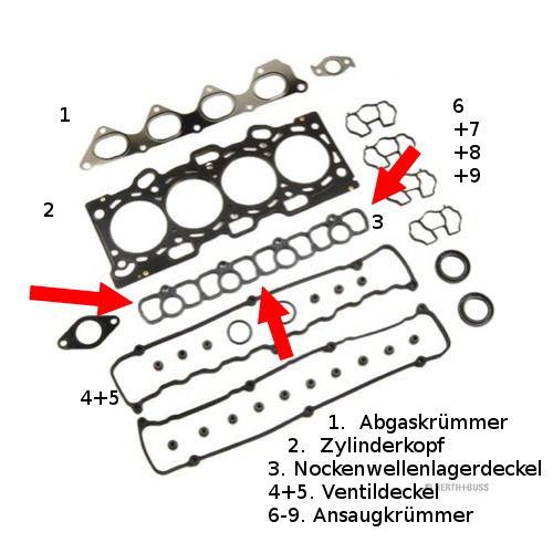 Wo ich mir aber ziemlich sicher bin, ist dass die Dichtung, auf die die ganzen Pfeile zeigen, zwischen Ansaugbrücke und Zylinderkopf kommen.