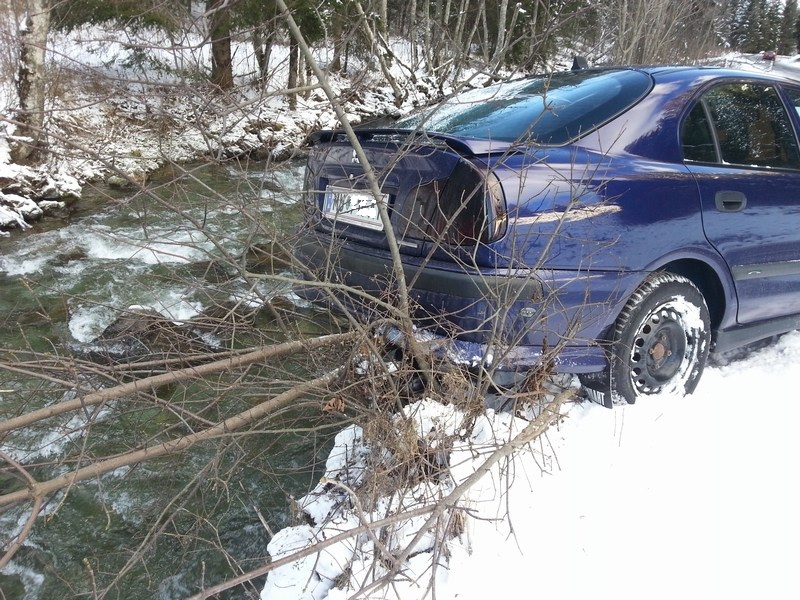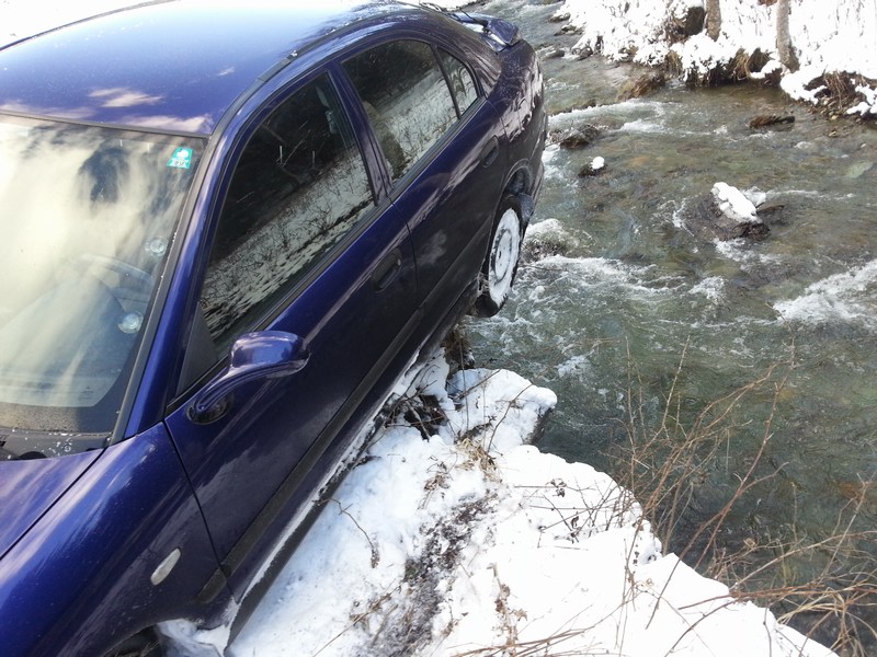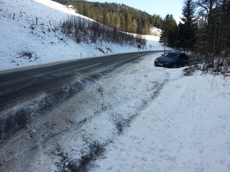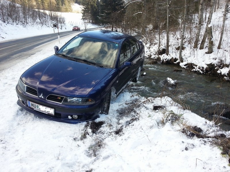 Ich bin heute um 14:00 Uhr nach hause gefahren mit angepasster Geschwindigkeit natürlich und bin dennoch ins Schleudern geraten ... ich konnte einige Zeit lang die Spur noch halten bis ich auf eine zweite Eisplatte geriet und die hat mich dann rausgeworfen .... Zum Glück bin ich genau auf einen Busch der vor dem Bach wuchs aufgelaufen und der hat mich(wobei mir vermutlich net viel passiert währe) und meinen Cari gerettet .... aber siehe Bilder -->