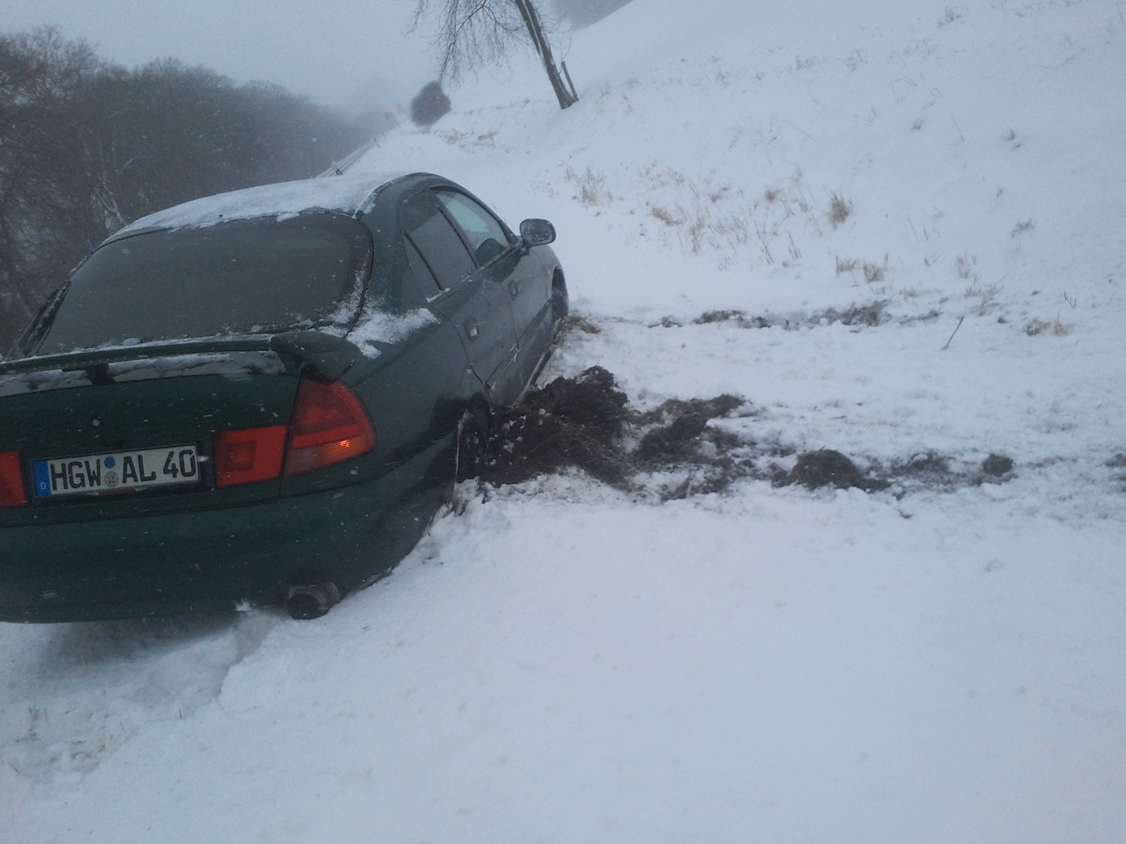 Mein zweiter Glücksfall war denn noch, dass die Erde unterm Schnee vom Straßengraben noch weich war und nicht gefroren. Dadurch hat sich mein Auto regelrecht ins Erdreich gebort, was das Abbremsen des Fahrzeugs beschleunigte, auch die Tieferlegung tat ihren Beitrag dazu bei, weil der Unterboden auch bremste. Deswegen blieb ich noch an der "Klippe" vom Graben hängen und flog nicht komplett rein...