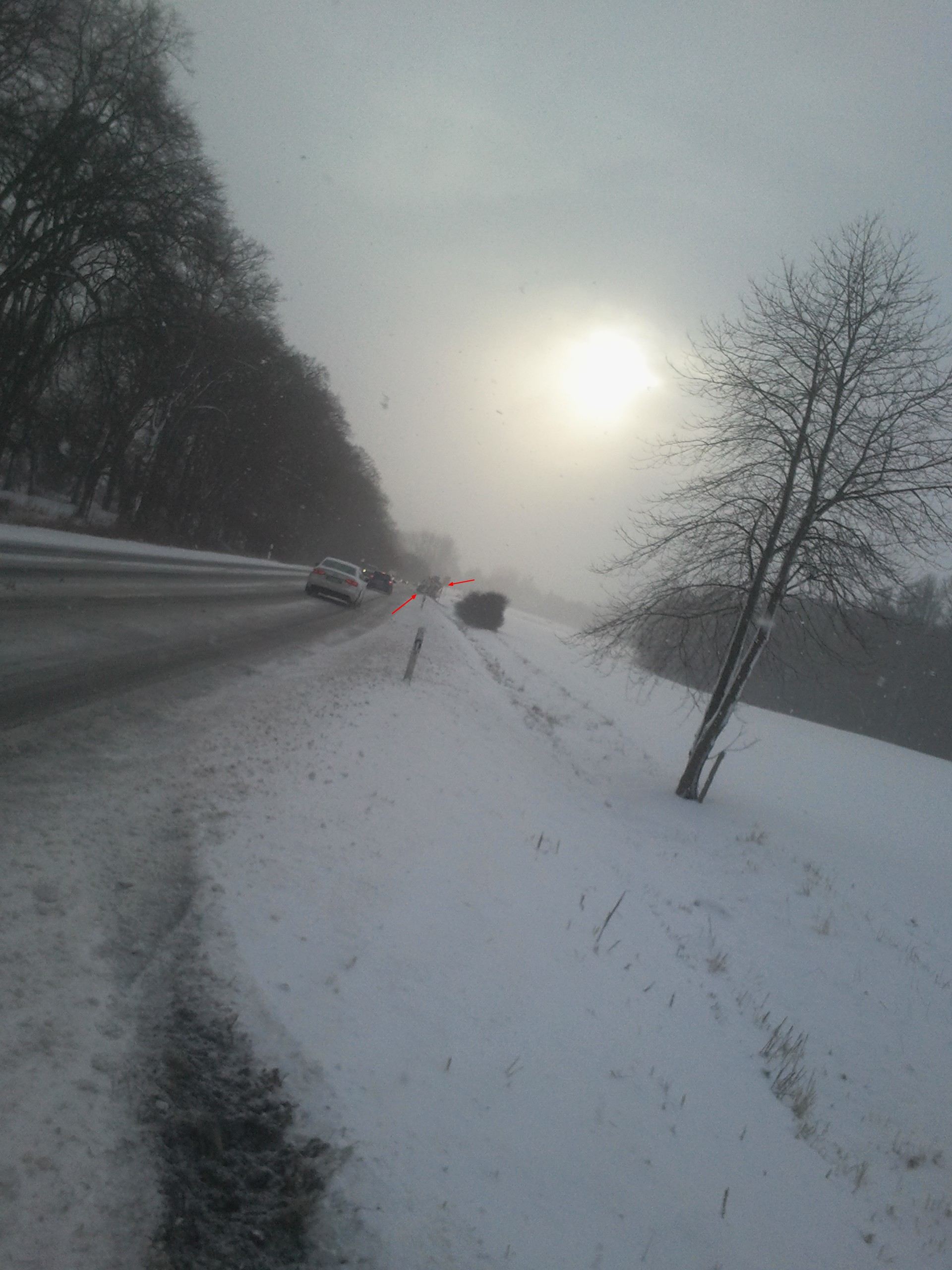 Ganze 5 Minuten nachdem ich die Fotos gemacht hatte, kam der erste Räumdienst vorbei (großes Fahrzeug) und landete ganze 200m weiter auch im Graben und stand kurz vorm Umkippen!!! Es war richtig mies glatt auf der Straße!
