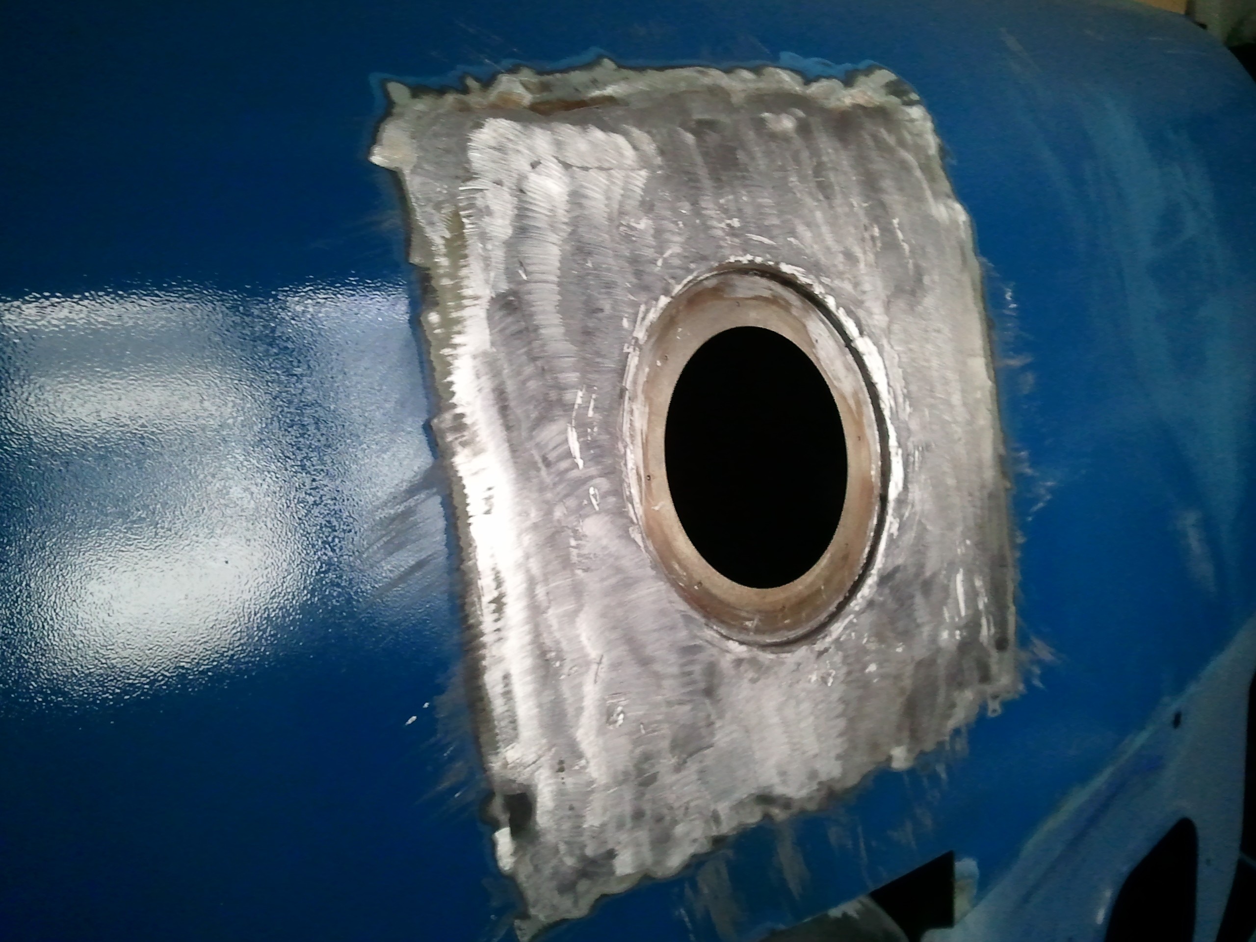 • dort wo bis jetzt der originale, rechteckige "Außen"-Tankdeckel lag, wird ein Blech für den Sandtler-Tankdeckel eingeschweißt