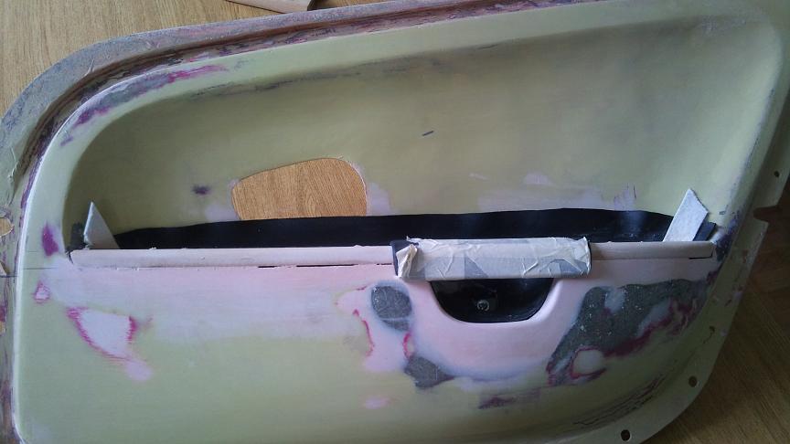 .Also habe ich den zwischenraum mit Spachtelmasse passend gemacht.Somit mußte auch die Halterung an den Türen selber verlegt werden. Was aber kein Problem war.So habe ich erstmal die beiden hinteren Verkleidungen wieder eingbaut.