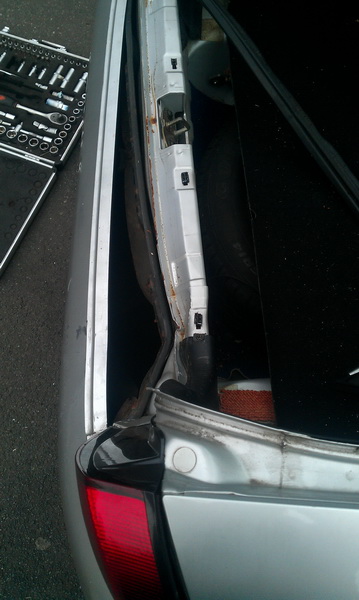 Ich werd mich gleich mal ranmachen und gucken, dass ich die Klappe aufkriege, damit ich seh, wieviel der Rahmen wirklich Schaden genommen hat. Neue Heckklappe muss auf jeden Fall ran, Stoßstange geht noch, muss nich unbedingt sofort neu. Eine Halterung is zwar abgerissen, aber die kann man erstmal so befestigen, dass es hält.