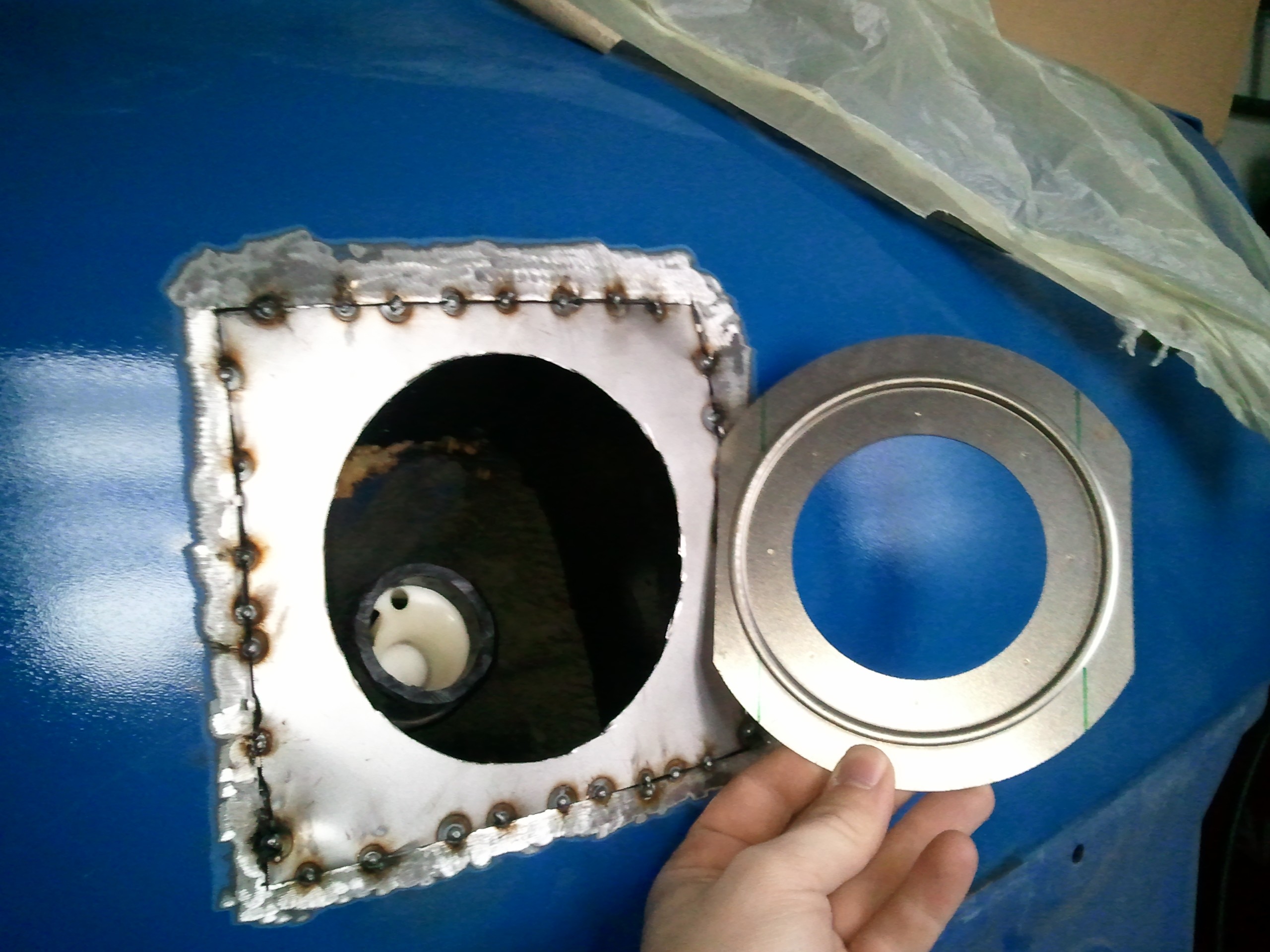 • dort wo bis jetzt der originale, rechteckige "Außen"-Tankdeckel lag, wird ein Blech für den Sandtler-Tankdeckel eingeschweißt
