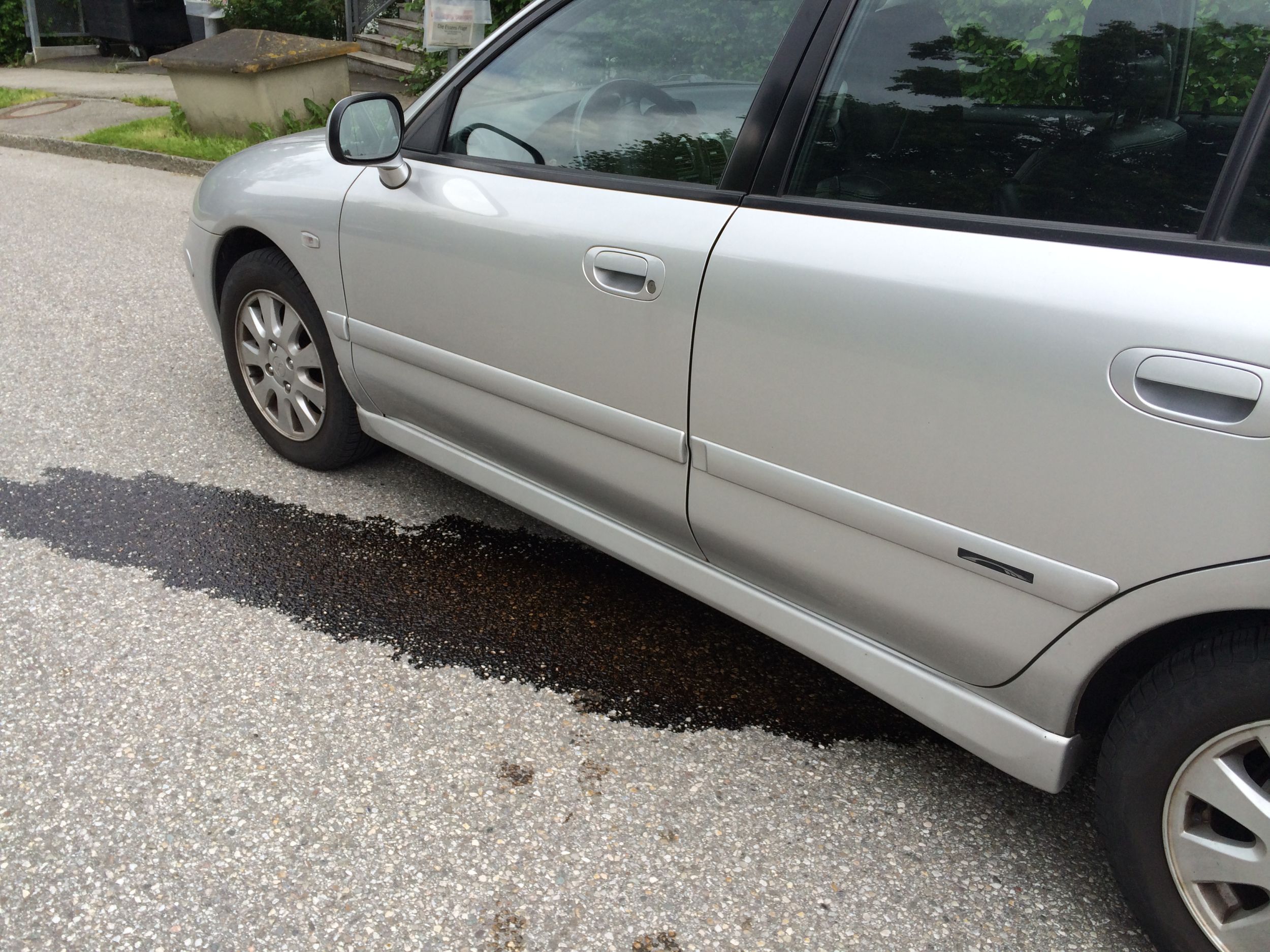 Danach bin ich paar Minuten im Auto sitzen geblieben um Nachzudenken was ich nun tun soll und als ich Ausstieg sah ich schon eine relativ groß deutliche Leckage bzw. Pfütze unterhalb des Autos und es roch nach Benzin.