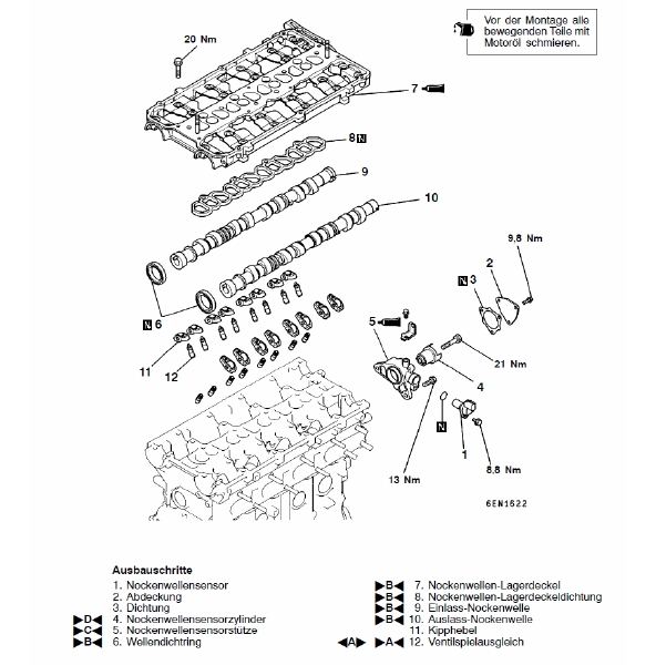 Der "Nockenwellen-Lagerdeckel" (so heißt der Deckel) zwischen dem Zylinderkopf selber und dem Ventildeckel, der ab muss um an die besagte Dichtung (Nockenwellen-Lagerdeckeldichtung) zu kommen muss ab, also werden die Nockenwellen gelöst.