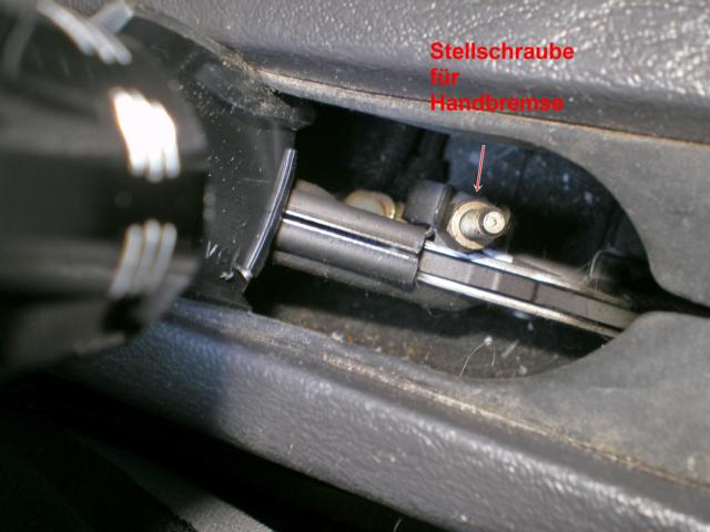 Unter dem Mitteltunnel im innenraum. Diesen baust du aus. Und dann siehst du da eine Mutter, diese ziehst du nach und stellst somit die Handbremse ein.