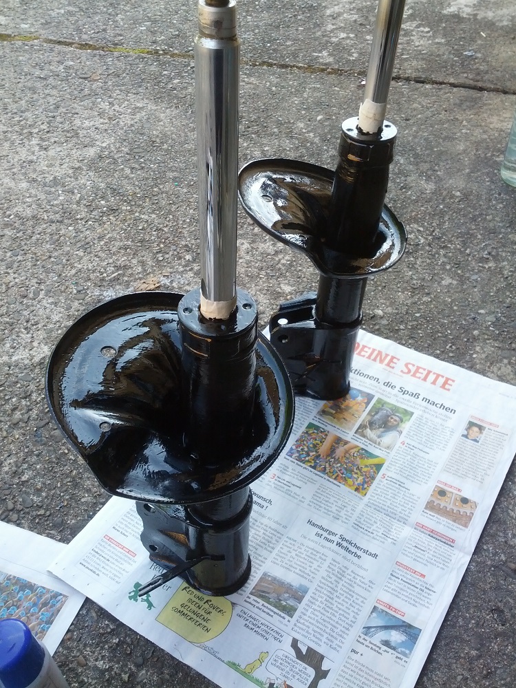 Ich hab meine vordere Aufhängung mal ein bisschen aufgefrischt und gleich alles entrostet und neu versiegelt. Ebenfalls habe ich die ersten zwei Windungen der Federn mit schrumpfschlauch ummantelt. Angafangen da vorne zu arbeiten habe ich aufgrund von Knarzen an der Vorderachse beim einlenken.