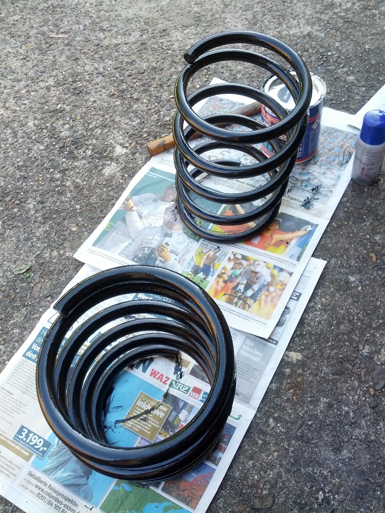 Ich hab meine vordere Aufhängung mal ein bisschen aufgefrischt und gleich alles entrostet und neu versiegelt. Ebenfalls habe ich die ersten zwei Windungen der Federn mit schrumpfschlauch ummantelt. Angafangen da vorne zu arbeiten habe ich aufgrund von Knarzen an der Vorderachse beim einlenken.