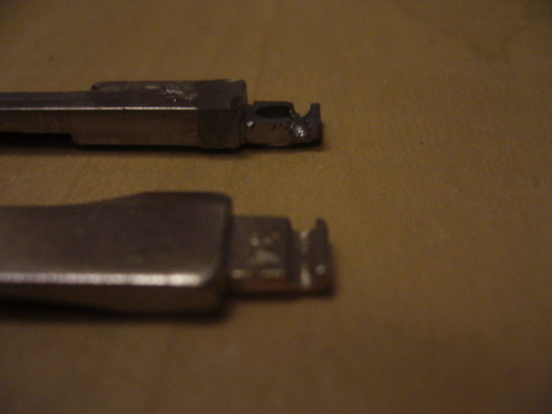 Dieses (habe ich leider beim 1. Schlüssel versaut) MUSS da bleiben, sonst bricht es aus. Das abschleifen sieht zuerst etwas komisch aus, durch den Winkel, den der Originalschlüssel hat, aber wird beim ersten Schnitt klar.