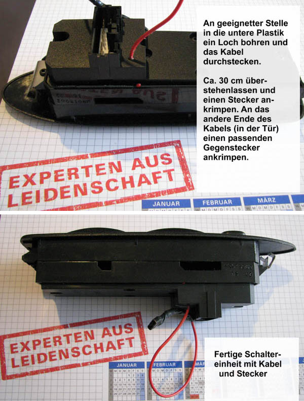 Die Türverkleidung kann wieder angebracht werden, die Fensterhebersteuereinheit wird später von Oben in die Verkleidung eingesteckt. Das zusätzliche Kabel sollte, zur leichteren Montage, etwas aus dem "Schalterloch"der Türverkleidung überstehen. Einen Steckverbinder an das Kabel anbringen.